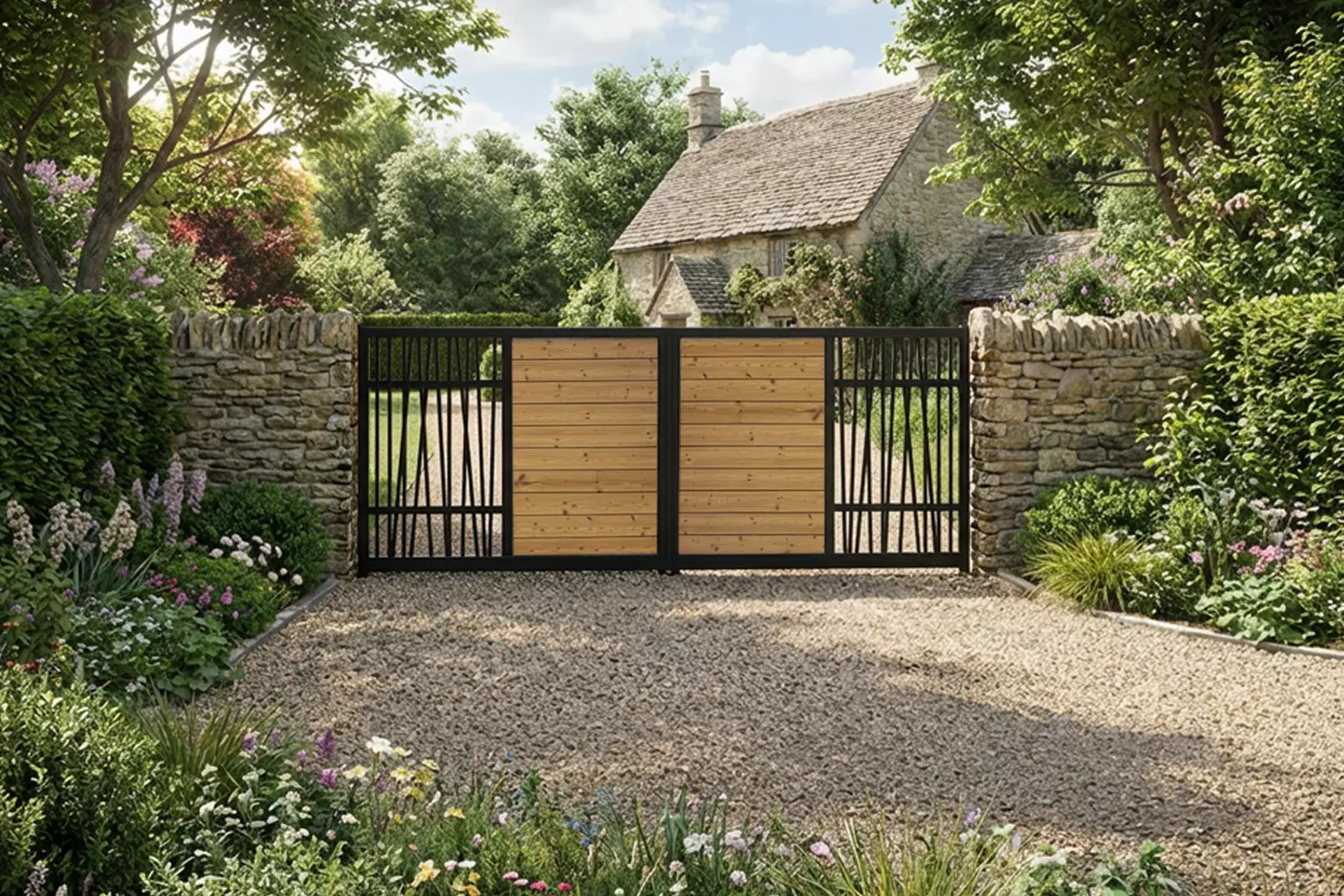 Le portail FORENIA associe une partie centrale en pin thermotraité à des tubes aluminium latéraux effet bambou, créant un style unique mêlant naturel et modernité. Ce design apporte à la fois chaleur visuelle et légèreté.