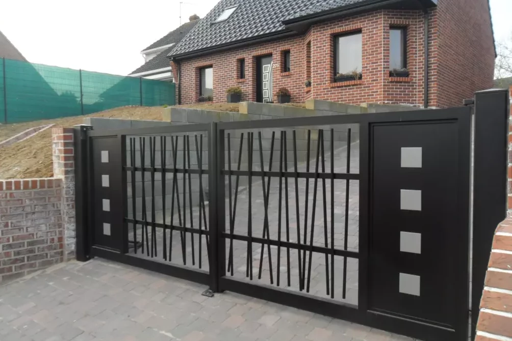 Portail coulissant motorisé et portillon en aluminium gris anthracite, création sur mesure avec découpe laser oiseaux et lignes dynamiques, installé dans le Nord de la France. Fabrication française Eurofactory